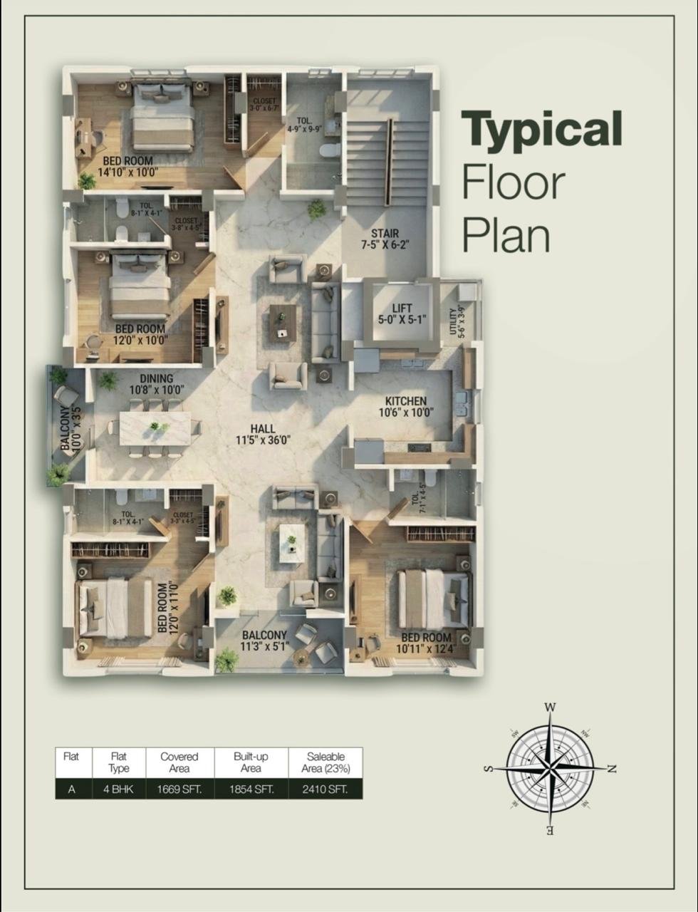 Electric: Concealed copper wiring with the latest modular switches, points of AC, TV & telephone in the Living Room & all Bedrooms, Power Points and Exhaust fan points in the Kitchen & Toilets.